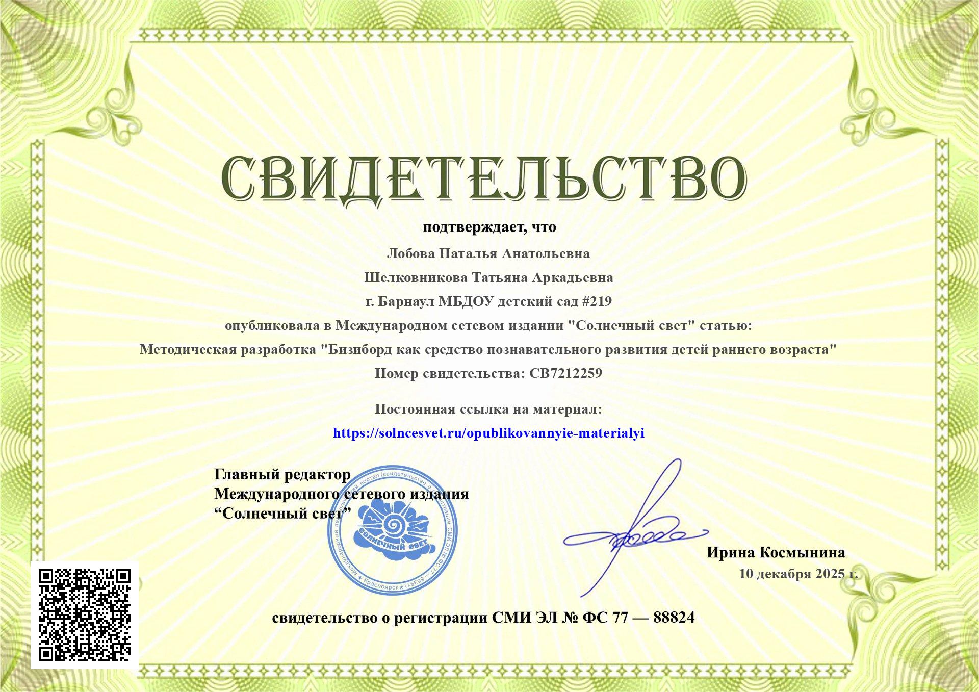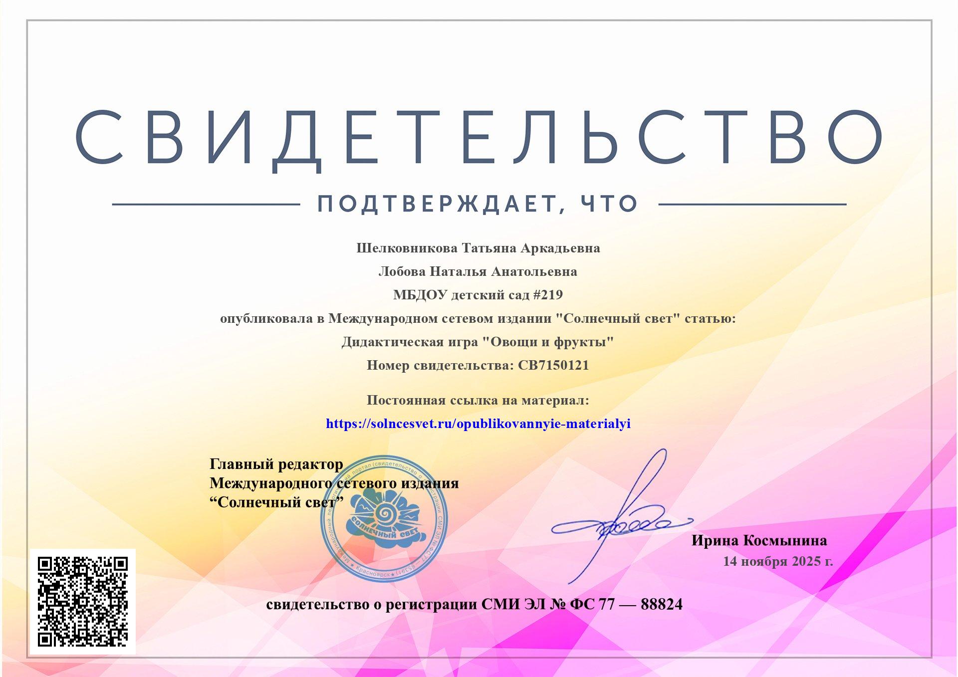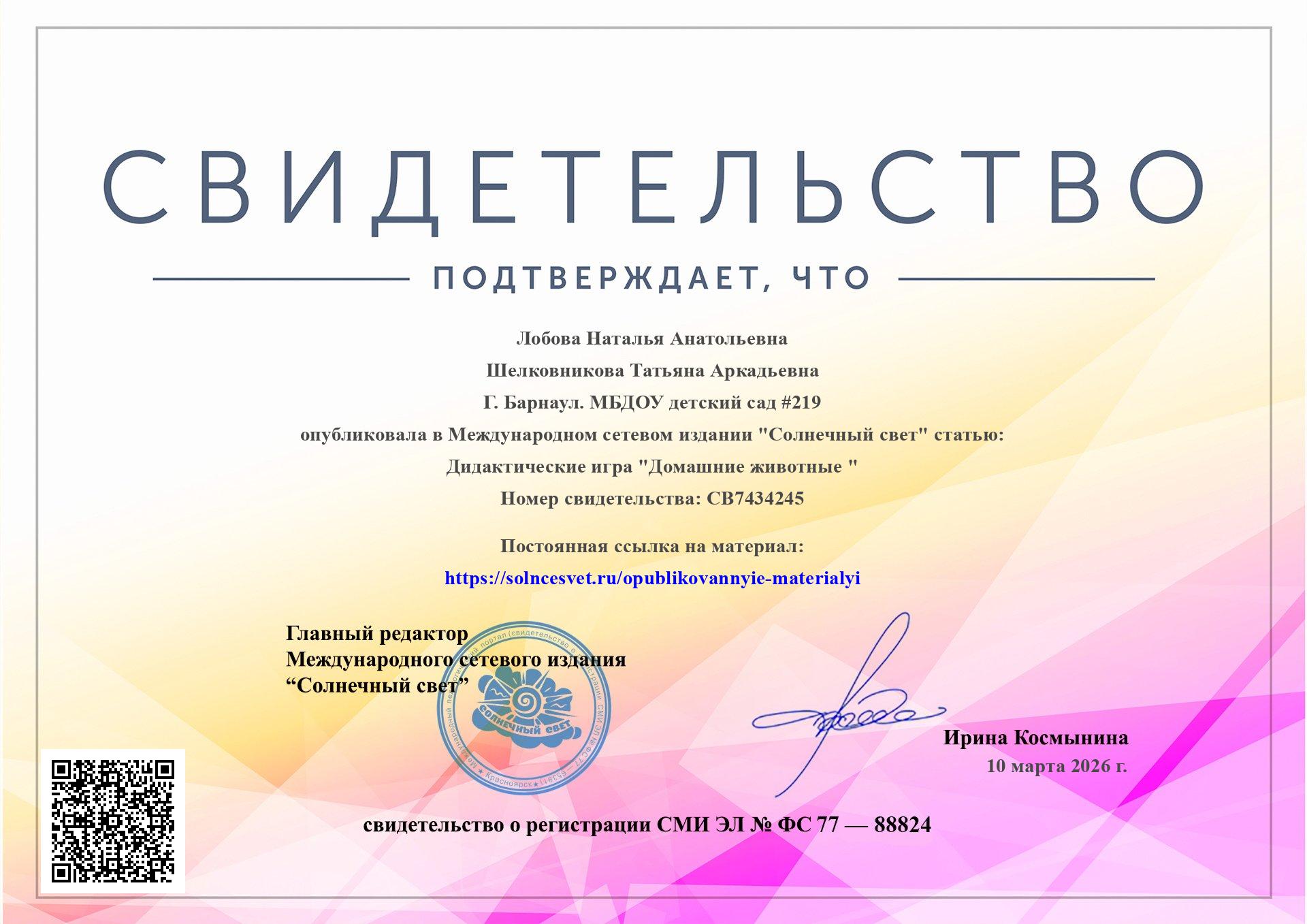 - Свидетельство о публикации